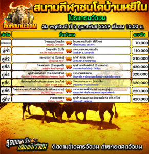 โปรแกรมวัวชน สนามกีฬาชนโคบ้านหยีใน วัน พฤหัสบดี ที่ 5 กุมภาพันธ์ 2569