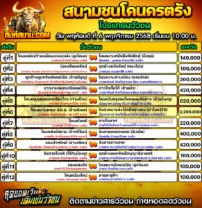 โปรแกรมวัวชน สนามกีฬาชนโคนครตรัง วันที่ 6 พฤศจิกายน 2568
