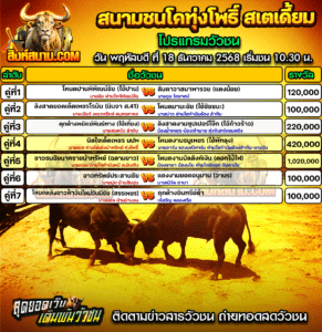 โปรแกรมวัวชน สนามกีฬาชนโคทุ่งโพธิ์ สเตเดี้ยม วันพฤหัสบดี ที่ 18 ธันวาคม 2568