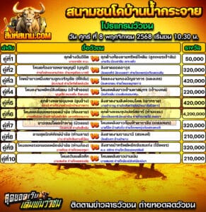โปรแกรมวัวชน สนามกีฬาชนโคทะเลหลวงสุโขทัย วันที่ 30 มีนาคม 2568แ