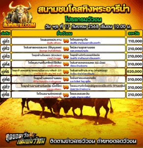 โปรแกรมวัวชน สนามกีฬาชนโคสทิ้งพระอารีน่า วันที่ 17 กันยายน 2568