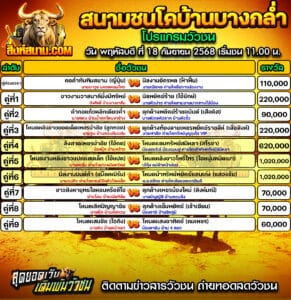 โปรแกรมวัวชน สนามกีฬาชนโคบ้านบางกล่ำ วันที่ 18 กันยายน 2568