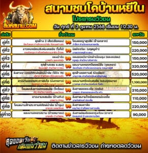 โปรแกรมวัวชน สนามกีฬาชนโคบ้านหยีใน วันที่ 3 ตุลาคม 2568