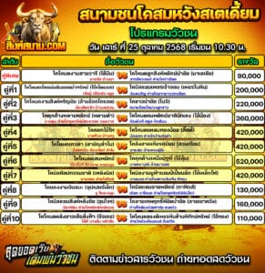 โปรแกรมวัวชน สนามกีฬาชนโคสมหวังสเตเดี้ยม วันที่ 25 ตุลาคม 2568