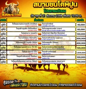 โปรแกรมวัวชน สนามกีฬาชนโคพิปูน วันที่ 31 ธันวาคม 2568