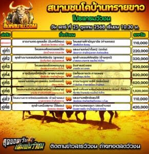 โปรแกรมวัวชน สนามกีฬาชนโคบ้านทรายขาว วันที่ 25 ตุลาคม 2568