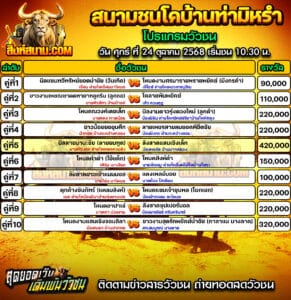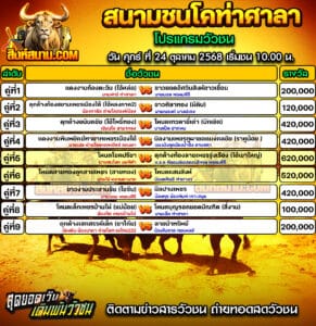 โปรแกรมวัวชน สนามกีฬาชนโคท่าศาลา วันที่ 24 ตุลาคม 2568