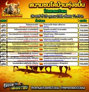 โปรแกรมวัวชน สนามกีฬาชนโคบ้านทุ่งขมิ้น วันที่ 25 ตุลาคม 2568