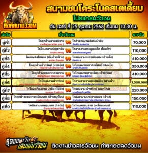 โปรแกรมวัวชน สนามกีฬาชนโคระโนดสเตเดี้ยม วันที่ 25 ตุลาคม 2568