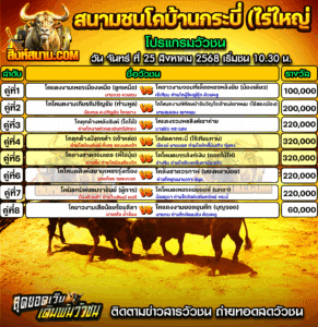 โปรแกรมวัวชน สนามกีฬาชนโคกระบี่(ไร่ใหญ่) วันที่ 25 สิงหาคม 2568