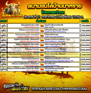 โปรแกรมวัวชน สนามกีฬาชนโคบ้านนาทราย วันที่ 21 พฤศจิกายน 2568