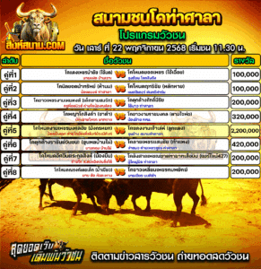 โปรแกรมวัวชน สนามกีฬาชนโคท่าศาลา วันที่ 22 พฤศจิกายน 2568