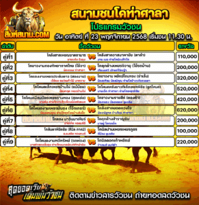 โปรแกรมวัวชน สนามกีฬาชนโคบ้านท่าศาลา วันที่ 23 พฤศจิกายน 2568