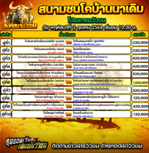 โปรแกรมวัวชน สนามกีฬาชนโคบ้านนาเดิม วันที่ 2 ตุลาคม 2568