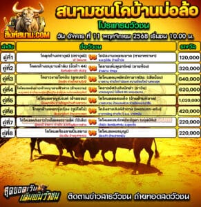 โปรแกรมวัวชน สนามกีฬาชนโคบ้านบ่อล้อ วันที่ 11 พฤศจิกายน 2568