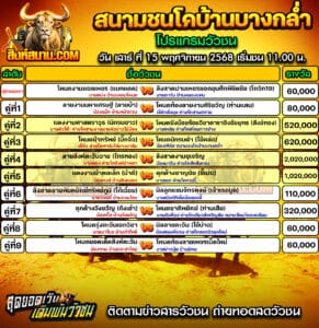 โปรแกรมวัวชน สนามกีฬาชนโคบางกล่ำ วันที่ 15 พฤศจิกายน 2568